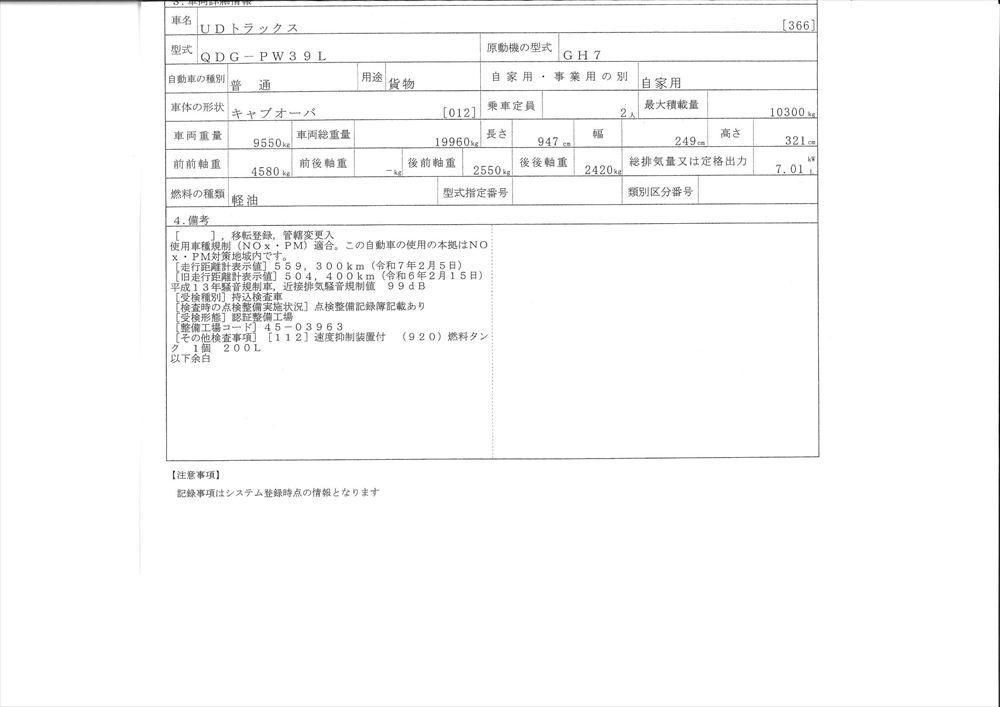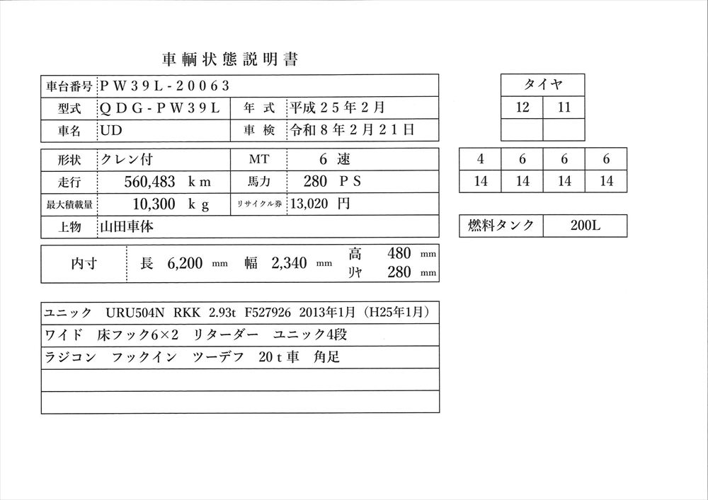 | コメント | クレン付 UD 型式 QDG-PW39L 車台番号 PW39L-20063 積載 10300㎏ ユニック4段 ラジコン フックイン ボデー内寸 L6.2m ワイド2.34m H48 床フック6×2 6速ミッション 280ps リターダー 価格のお問い合わせ052-821-1557名輸自動車中谷(ナカヤ)までお電話お待ちしてます。 |
